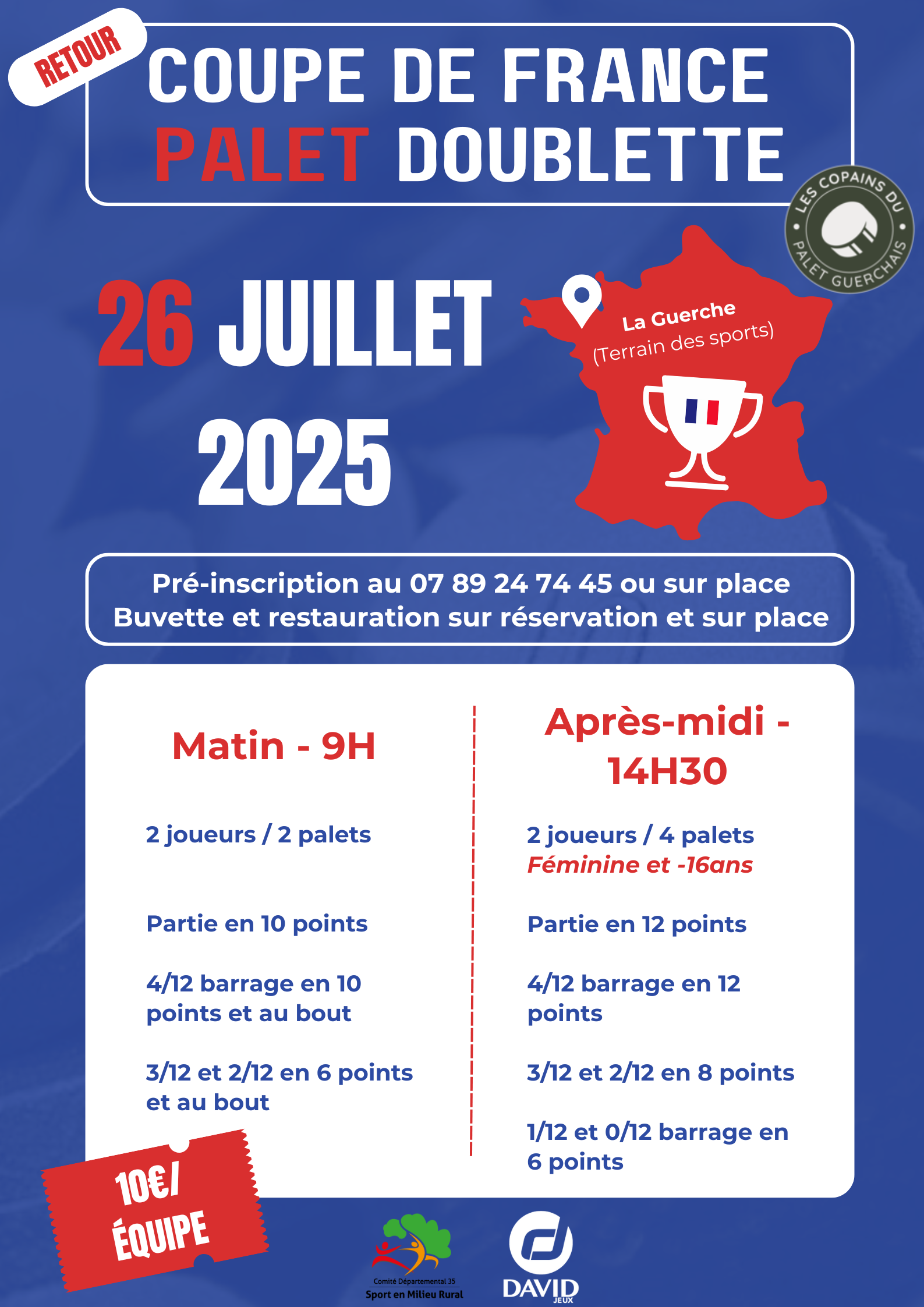 C’est le retour de la Coupe de France Doublette – Fonte sur bois à La Guerche-de-Bretagne (35), le samedi 26 juillet ! Organisé par Les Copains du Palet Guerchais et soutenu par notre comité, inscrivez-vous à cet événement emblématique du palet !