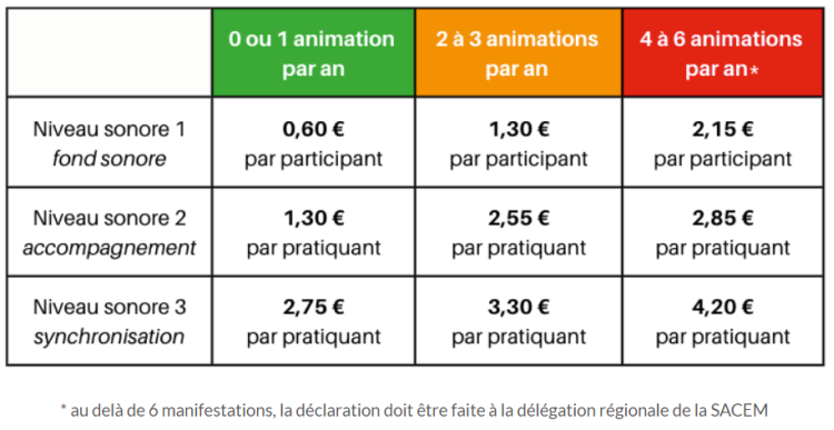 - Diffusion de musique lors de la pratique d’activités sportives de type gymnastique d’entretien, danse, etc. : certaines associations, notamment celles proposant des activités telles que la gymnastique d’entretien, la danse, ou d’autres activités similaires, peuvent utiliser de la musique dans le cadre de leurs cours. Dans ce cas, l’association est redevable des droits à la SACEM et la SPRE.
